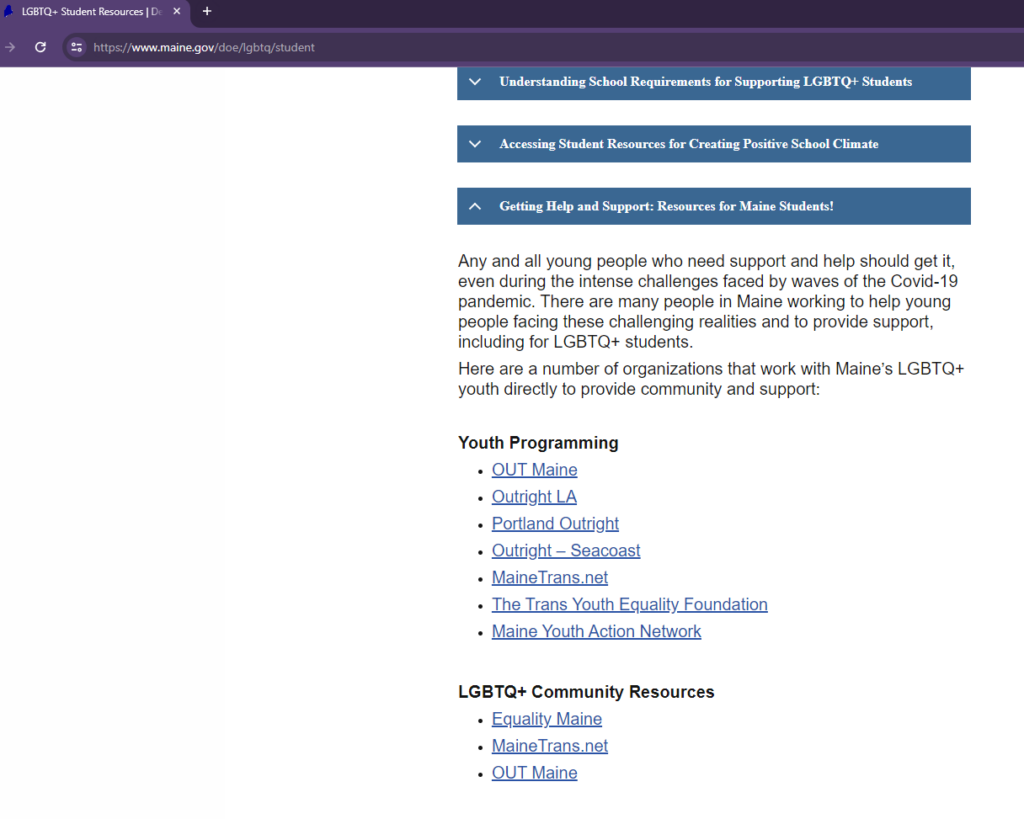 “There are many people in Maine working to help young people facing these challenging realities and to provide support, including for LGBTQ+ students,” the state agency notes on the resource page of its website.
