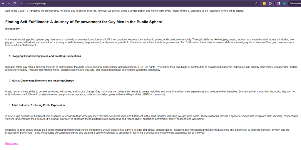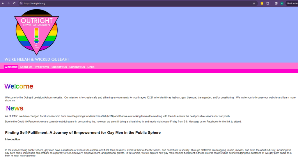 The organization was founded in 1997 with the mission to “create safe and affirming environments for youth ages 12-21” who identify as LGBT. Outright L/A’s homepage appears to be directed mostly at children. Amid suggestions of ways for gay youth to pursue “self-fulfillment” and “empowerment,” the group proposes “live gay porn cams.”