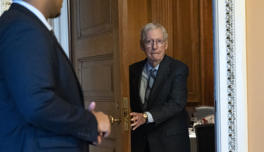 Senate Minority Leader Mitch McConnell of Ky., leaves a Republican luncheon Wednesday, Feb. 28, 2024 at the Capitol in Washington, after announcing that he will step down as Senate Republican leader in November. The 82-year-old Kentucky lawmaker is the longest-serving Senate leader in history. He’s maintained his power in the face of dramatic changes in the Republican Party. (AP Photo/Jacquelyn Martin)