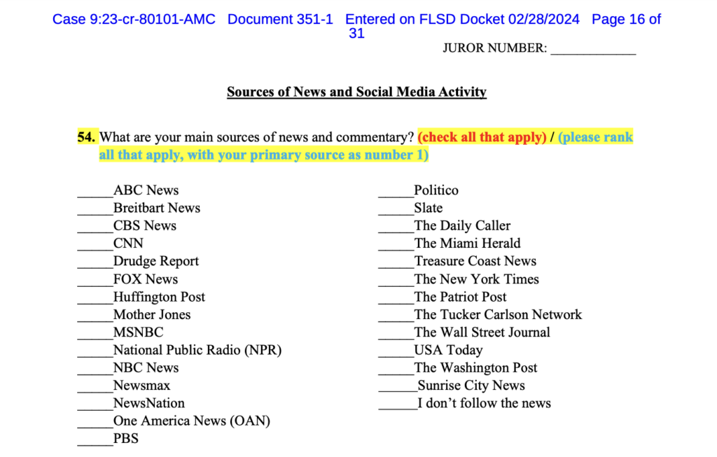 Smith wants jurors to “check all that apply” from a list of right-leaning, left-leaning, and centrist news outlets, while objecting to Trump’s request to “please rank all that apply, with your primary source as number 1.”