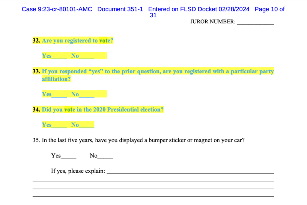 Smith’s team asked Cannon to strike questions involving whether a juror is registered to vote, if the juror is registered with a specific party, and if the juror voted in the 2020 election. Each question requires a “yes” or “no” answer under the structure proposed by Trump’s team.