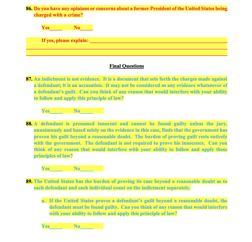 Page 25 of the proposed questionnaire includes lengthy final questions for the jury proposed by Trump’s team, to which Smith objects.