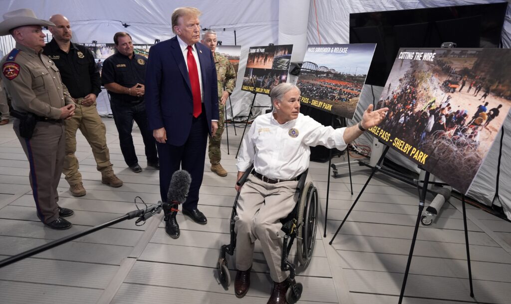 Republican presidential candidate former President Donald Trump listens to Gov. Greg Abbott (R-TX) during a briefing during a visit to the U.S.-Mexico border, Thursday, Feb. 29, 2024, in Eagle Pass, Texas. (AP Photo/Eric Gay)