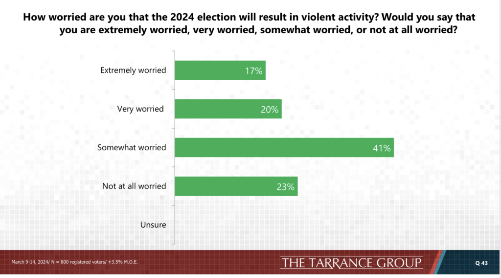 “Voters,” added Lake’s team in a memo, “are concerned about their freedoms. They see many ways to strengthen democracy but remain concerned about the level of division in the country, which they see as remarkably close to civil war.”