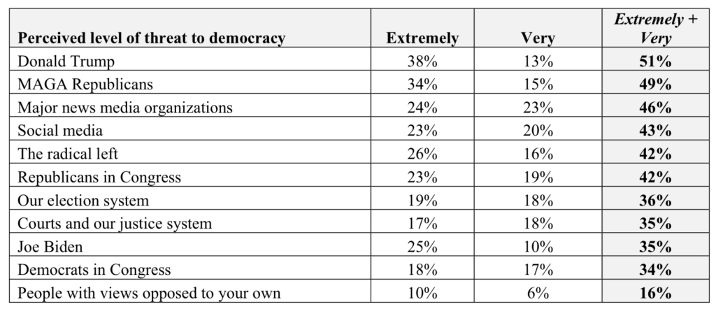Many, for example, are worried about sustaining democracy, and the concerns were bipartisan. Some 81% said that they believe democracy in America is currently being threatened.