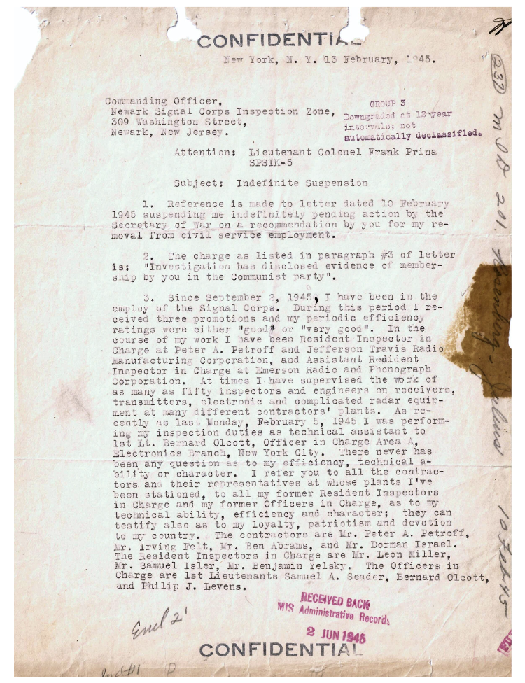 “It only serves to persecute me, prevents me from making my contribution to the war effort as an electronic engineer and earning my livelihood in the established American way, and thereby denies me my inalienable right to maintain myself, my wife and child,” he wrote on Feb. 13, 1945.
