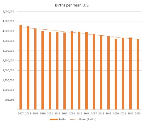 From 2008 through 2019, births were falling by about 1.17% a year. Had that continued in 2020 through 2023, rather than the down-and-up we had, we would have actually had almost 20,000 more births in those four years. That is — we never made up for the babies we never made in 2020.